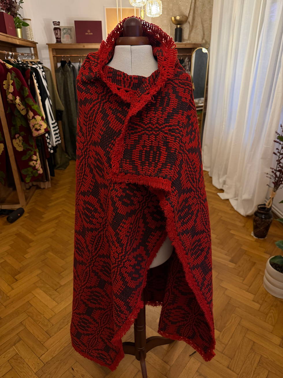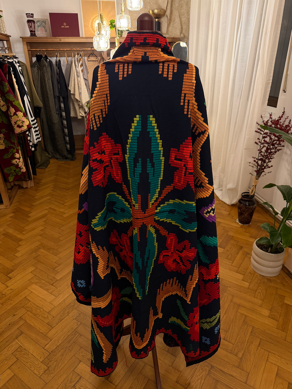Motivul central radial de fluture, înconjurat forme vegetale stilizate, amintește de simbolurile de protecție din țesăturile vechi. Dar privit mai atent, el sugerează și altceva — aripi desfăcute, mișcare circulară, metamorfoză.